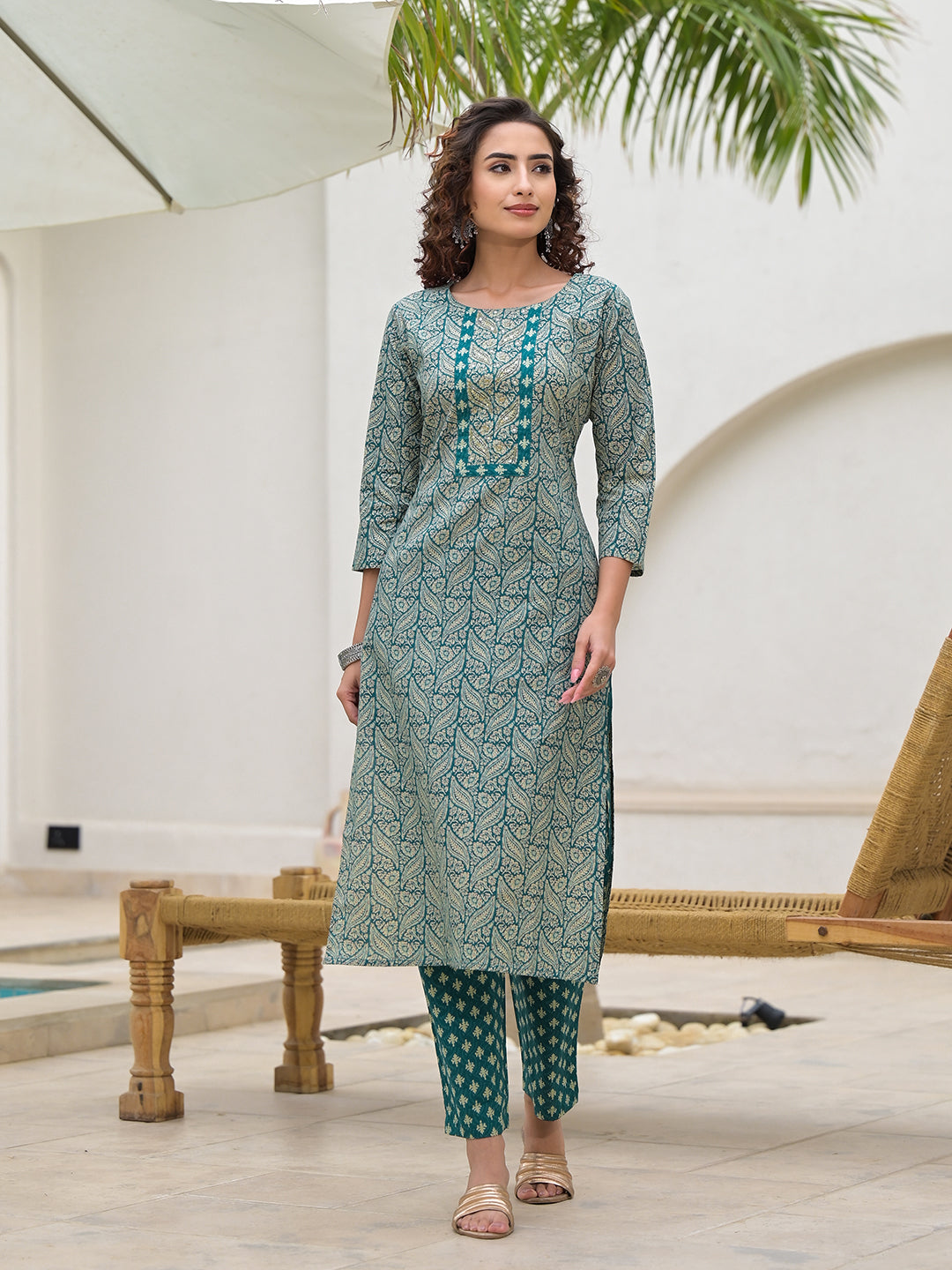 Crafted in breathable pure cotton, this teal green kurta set brings together comfort, balance, and careful detailing. The kurta features ethnic motif embroidery with subtle bead and stone accents, adding depth without overwhelming the design.