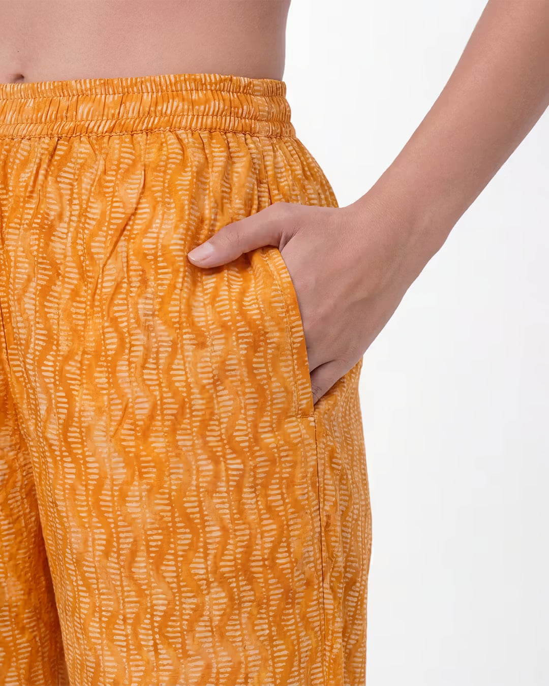 Paired with printed cotton trousers and a lightweight cotton voile dupatta, the set comes together with ease. The fabric remains breathable and gentle on the skin, making it well suited for long days, casual gatherings, or quiet festive moments where simplicity feels just right.