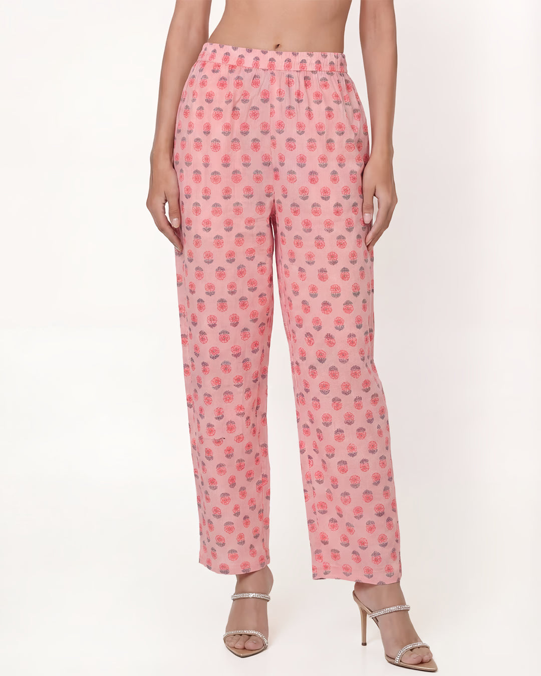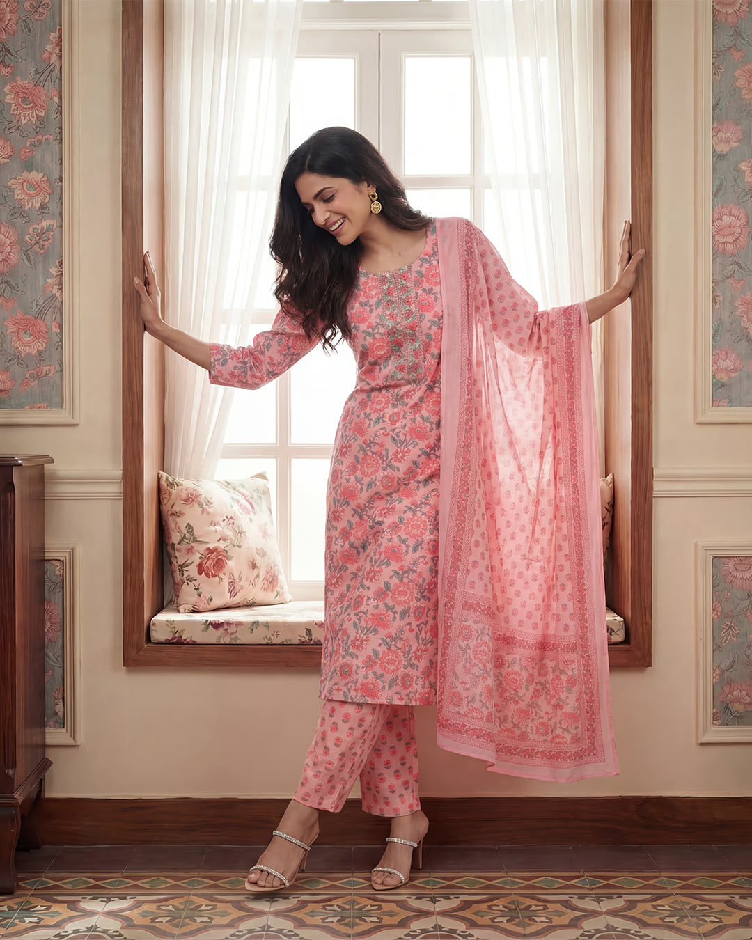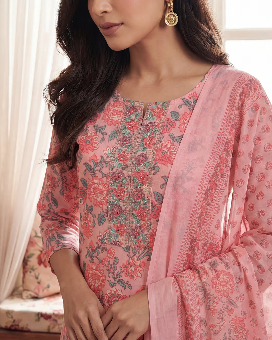 Designed for comfort that looks considered, this pastel pink kurta set is crafted in 100% pure cotton and finished with gentle floral prints that feel light, fresh, and timeless. The straight-cut kurta features an embroidered panel at the round neckline, adding a subtle handcrafted touch that elevates the simplicity of the silhouette.