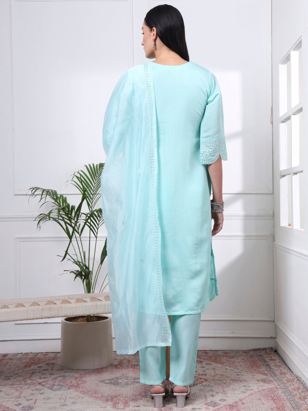 This Sky blue kurta set is crafted in a silk-blend fabric that offers a smooth drape with a gentle sheen. Designed in a clean straight silhouette, the kurta is detailed with fine thread embroidery and finished with a scalloped hem—adding a subtle sense of depth while keeping the look composed.